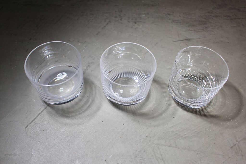 すっきりと潔い直線の「角出し(かくだし)」、繊細な光の線が美しい「千筋(せんすじ)」、そして魚の鱗のように細かく煌めく「魚子(ななこ)」。 あえてグラス全体に装飾を施すのではなく、削ぎ落とされたミニマルなカットに留めることで、ガラスそのものの美しさと、静かで洗練された佇まいを引き出しています。