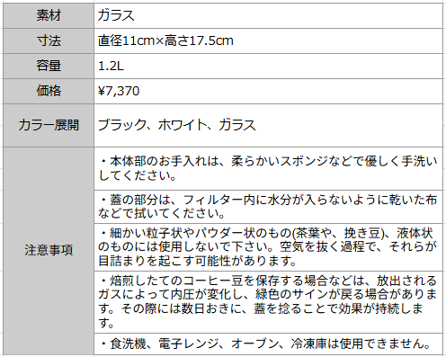 VIVO.で取り扱っているサイズは1.2Lです。珈琲豆だと約450gが入ります。