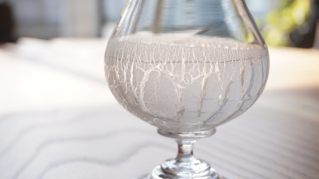 白土はクリアガラスに映える陶土が生み出す白い模様が繊細なレースのような美しさです。